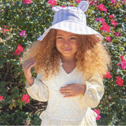 This stripy bunny sun hat is the perfect hat for Easter adventures. With two floppy little ears and made in the pink striped fabric, this hat will keep you feeling super hoppy all spring long!! The perfect pairing for the stripy bunny bucket bag!