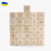 - Each block features four engraved sides showing an illustration, an uppercase letter, a lowercase letter and a word matching the alphabet letter they represent (not necessarily the first letter in a word) - with two plain sides: top and bottom.