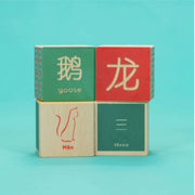 Uncle Goose Chinese Language Blocks - Each block reveals a debossed Mandarin Chinese character representing the word for an animal. On its opposing side, find the same character paired with its English translation. See a hand-crafted picture of the animal on yet another side. Also featured: a stroke grid, Mandarin/English numbers; plus a bold Chinoiserie design.