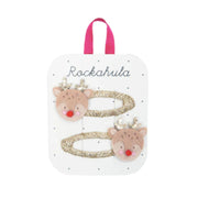 These Rockahula Little Reindeer Clips are the cutest addition to any Christmas outfit! With glittery gold antlers, the brightest red pom pom nose and secured to a gold ribbon wrapped snap clip. These clips make the perfect Christmas party accessory!