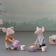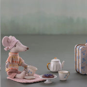 This Maileg Afternoon Treat is a special tea set and is the perfect size for a mouse paw. Each set includes all you need for a cozy moment with tea, cakes and tableware. It comes in a metal suitcase, lovely decorated with Maileg print. Add to your play theme with other coordinating pieces from our Maileg Mice Collection