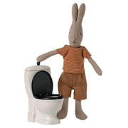 Complete your bathroom with Maileg Miniature Toilet. It is beautifully made in an off-white colour with a black seat. The seat can open and close, and the pull function of the handle makes it very realistic and playful! Fitted for sizes 1, and 2 Bunnies/Rabbits and Teddy families. This Toilet is perfect for Maileg's Dollhouse.