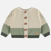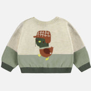 Knit Cardigan with Duck Illustration with green stripes at the bottom, a buttonhole with imitation wood buttons, ribbed knit wrists and waistband, and an illustration of a pretty duckling on the back. It is made from a soft cotton knit.