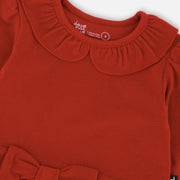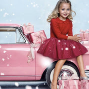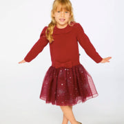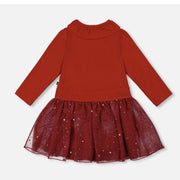 This Bi-Material Red Dress with a Glittering Skirt is made for twirling through special moments and sweet celebrations. This festive long-sleeve party dress features a soft brushed rib top with a scalloped collar, a sparkly tiered mesh skirt, and an adorable bow at the waist. A delightful choice for birthdays, holiday gatherings, and all kinds of magical occasions.