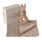 A perfect gift idea for the little ones. The set includes a soft cotton cloth and a small rabbit rattle. The rabbit has a small rattle inside that makes a soft sound. It all comes in a beautiful gift box.