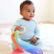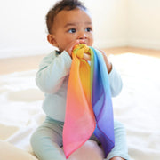 This wood baby teether has a 3" diameter solid Maple wood ring with a 21" x 21" Mini Playsilk securely knotted onto it.