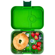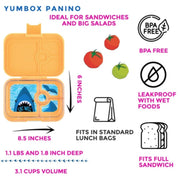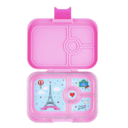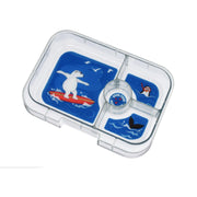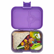 4-compartment food tray (illustrated) - Yumbox is a kid-friendly, bento-style container that fits easily into YumboxPoche or Classic Lunch Bag. The Yumbox is made out of two pieces, an exterior box and a tray insert that fit together to provide a LEAKPROOF solution for wet foods like yogurt, and applesauce (not water). Pack wet foods like yogurt and dips (not water). Purchase an extra tray for more variety