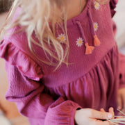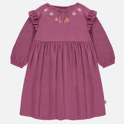 Regular fit purple-pink dress at the shoulders with flared bottom offering a feminine silhouette. Its round neck with a pretty decorative cord is encircled with flower embroidery for a bohemian look. Crafted in stretch cotton crepe jersey, this unique crumpled fabric mimics a woven material, adding instant chic to any design while remaining extremely comfortable. The puffy sleeves with ruffles at the shoulders and wrists tightened by elastics.