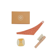 Open the gift-ready box to find a cotton bandana printed with Olli Ella's signature Dinkum Dog rainbows, a plush magnetic ball, and a wooden brush to keep Dinkum Dog coats shiny and clean. The ball is constructed with a magnetic element that allows the Dinkum Dogs to hold their favourite bone in their mouth so they never miss a delicious surprise.