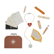 From Dinkum Dogs to Cozy Dinkums with sniffles, the Olli Ella Dinkum Dogs - Vet Set is equipped for all cuddly critter checkups. Foster creativity and imagination while exploring the world of care, kindness, and endless fun. Open the cardboard Vet case latch to find everything you need to nurse Dinkum Dogs back to health. Kiddos will love the magnetic wood thermometer, stethoscope, syringe, ointment tube, and sticky velcro that fastens the felt bandages and buster collar. Make notes on the medical records notepad and diagnose boo-boos with the patient cards. The wood accessories are constructed with the same magnetic element, allowing the Dinkum Dogs to hold their favourite bone in their mouth. Reward plush patients with treats from the Goodie Set.