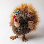 Theo Turkey may have plumage, but this turkey's taking no chances. He's knitted himself a bold teal hat, ready for the winter! Theo has oversized honey feet, a round cocoa tummy and a silky ginger tail. Most impressive, this proud turkey has a beautiful suedette caruncle (the wobbly bit under his beak). A dazzling gift for happy holidays.