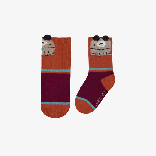 Souris MiniBurnt orange baby socks with touches of blue and brown in the colour block and a dog with ears sticking out at the top. Made in a comfortable stret...