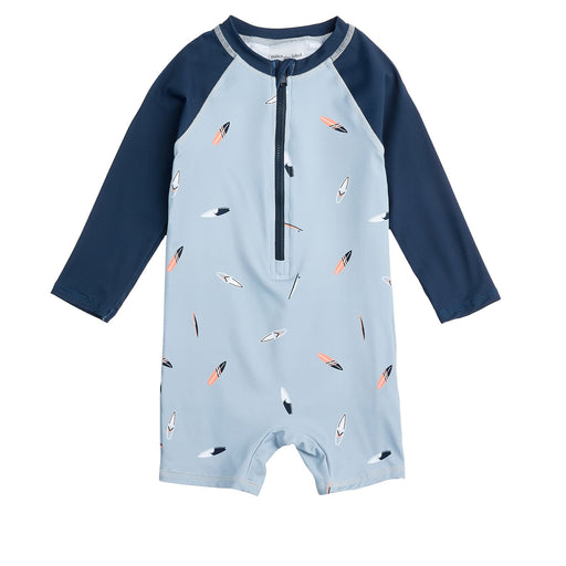 Miles The LabelThis long-sleeved swim romper offers extra protection for delicate skin. It’s skintight and features a high neckline and a long zip along the front...