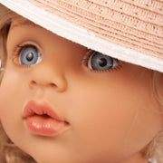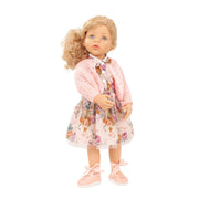 - The set includes a standing doll (690 g), a summer dress, a knit jacket, summer shoes, straw hat, woven handbag, sunglasses and underpants.