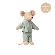 This Little Brother Mouse in Box, Blue Dots PJ with Magnet Hands is a classic Maileg item. This mouse is ready for hours of play and sleeps soundly in its matchbox. The clothes and bedding are made of soft fabrics with unique prints in beautiful colours.