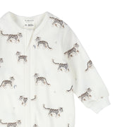 Leopard print footed sleeper. Made from soft, organically grown cotton jersey, it’s delicate on her skin and keeps her snug on cooler nights. The two-way zip is designed to make diaper changing or dressing a breeze, the ribbed cuffs keep her hands free for exploring.